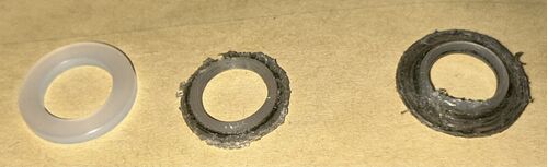 Heボンベの交換をしたとき、まずネジを回せなかった。 力持ちのパワーを借りてゆるめても、袋ネジが最後までとれない。 中を覗くとパッキンが???ボロボロ? 一時的に別の管をつないでゆっくり外しました。 超音波洗浄をかけて、その後乾燥すると、ほじり…